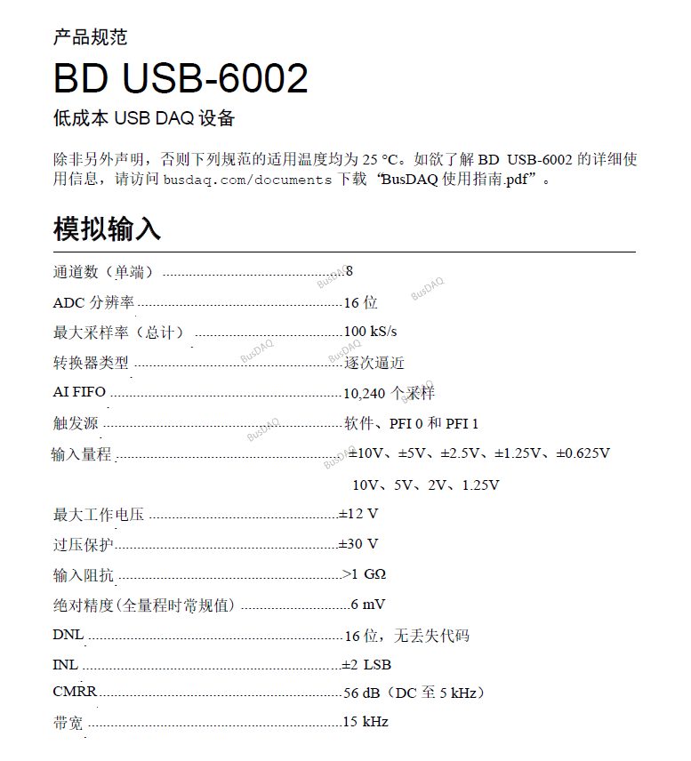 USB‑6002是一款低成本的多功能DAQ设备。 它提供了模拟I/O、数字I/O和一个32位计数器。 USB‑6002为简单的数据记录、便携式测量和院校实验室实验等应用提供基本的数据采集功能。 该设备具有轻便的机械外壳,采用总线供电,非常便于携带。 您可以通过螺栓端子接口轻松将传感器和信号连接到USB‑6002。 随附的DAQsc驱动程序和配置实用程序简化了配置和测量。